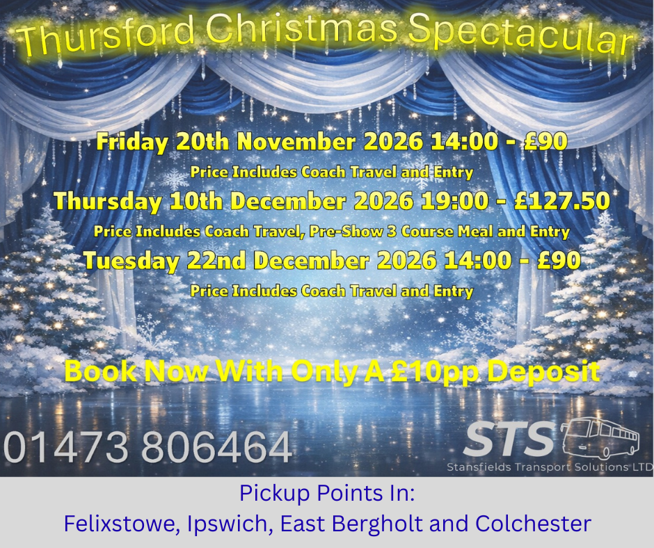 Stansfields are proud to offer a selection of Day Trips. Take a look below to see our December through March programme. To book on one of our trips please call our office on 01473 806464. We will be releasing our summer programme by January 2026. To join our mailing list please click the link below.